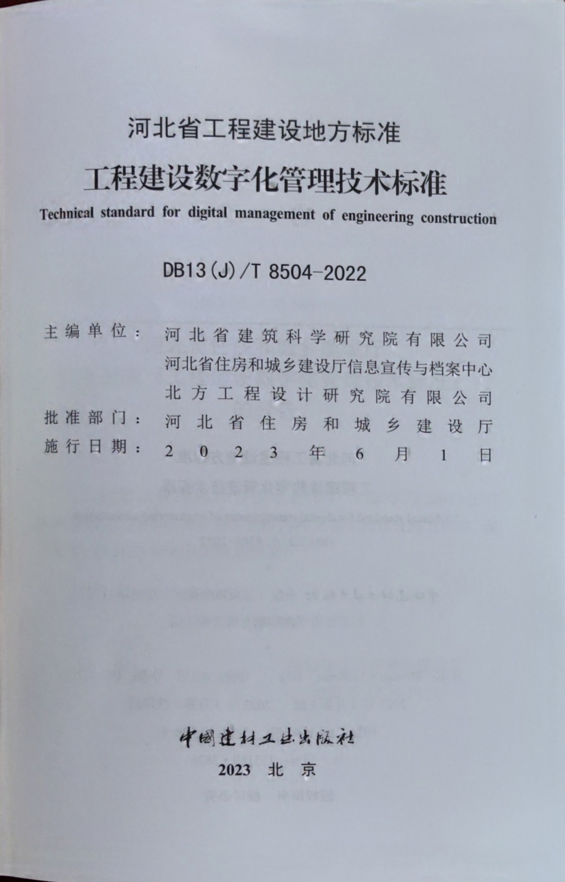 近日,由河北省建筑科學(xué)研究院有限公司、河北省住房和城鄉(xiāng)建設(shè)廳信息宣傳與檔案中心和北方工程設(shè)計研究院有限公司共同主編的《工程建設(shè)數(shù)字化管理技術(shù)標(biāo)準(zhǔn)》(DB13(J)/T8504-2022)已完成印刷,將于2023年6月1日起實(shí)施。